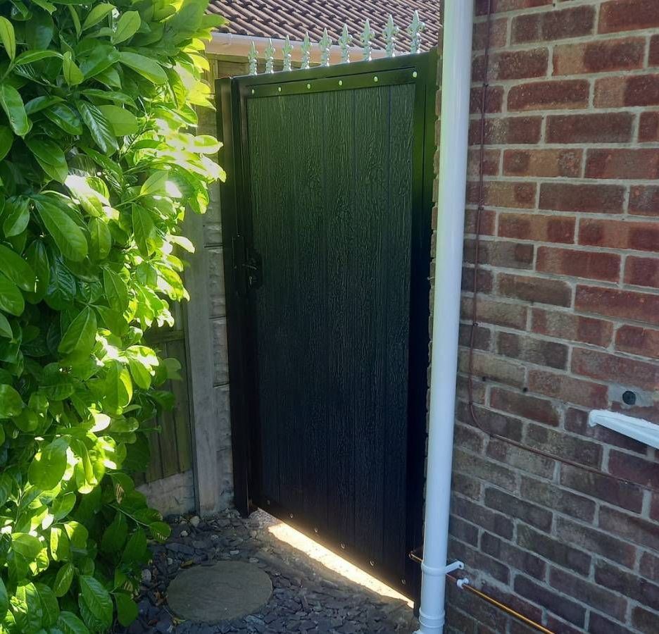 Virtually all composite gates feature a metal frame surround. Almost all our customers choose to have a black finish on the metal that provides a very neat frame and as well as helping with the aesthetics. It also provides a robust surround for the composites and keeps them in place when subjected to temperature fluctuation which will cause the boards to expand and contract a little over the seasons. They also provide a strong fixing point for hinges and other ironworks such as locks and bolts so once finished you will have a solid gate which will require little to no maintenance for many many years.